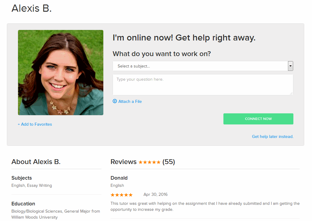 All of our students have the ability to match up to the first available tutor in an On-Demand Session, but some of them can also browse from a list of profiles and choose to Schedule an Appointment Session with a specific tutor.