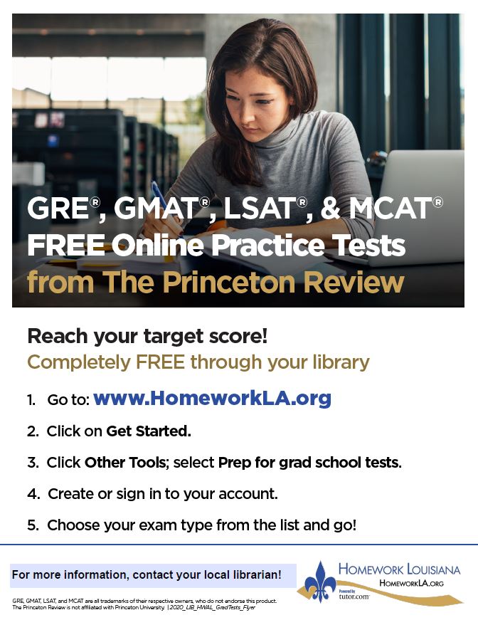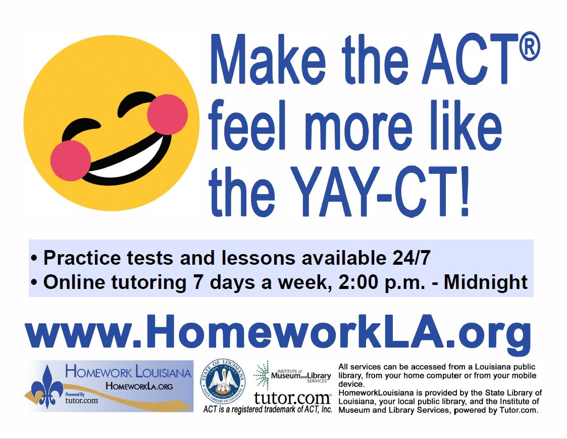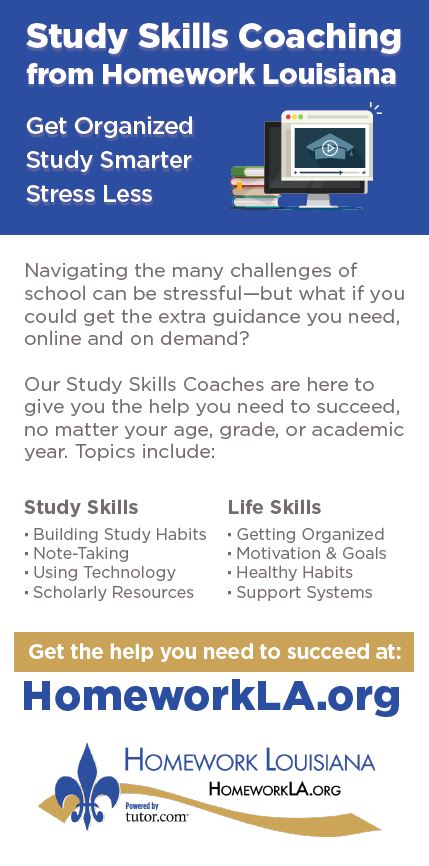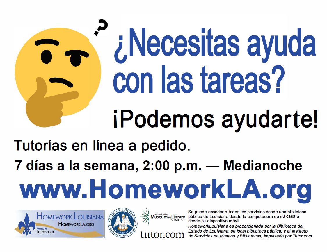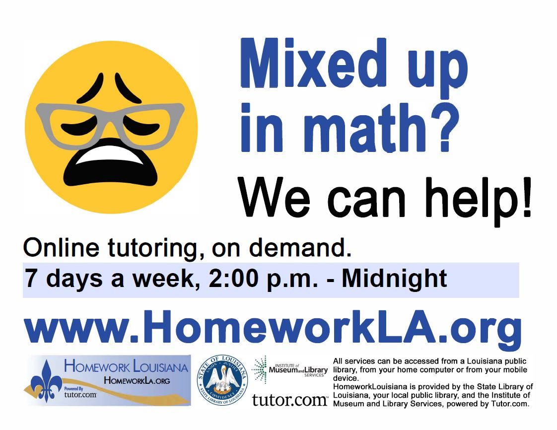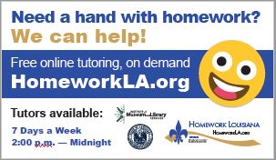 Use the materials below to advertise Homework Louisiana both in the library and around your community. Share with local teachers to hang up in their classrooms and distribute to students. Post on community bulletin boards around the community. If your library has multiple branches, each branch can distribute or hang posters and flyers around their neighborhoods.